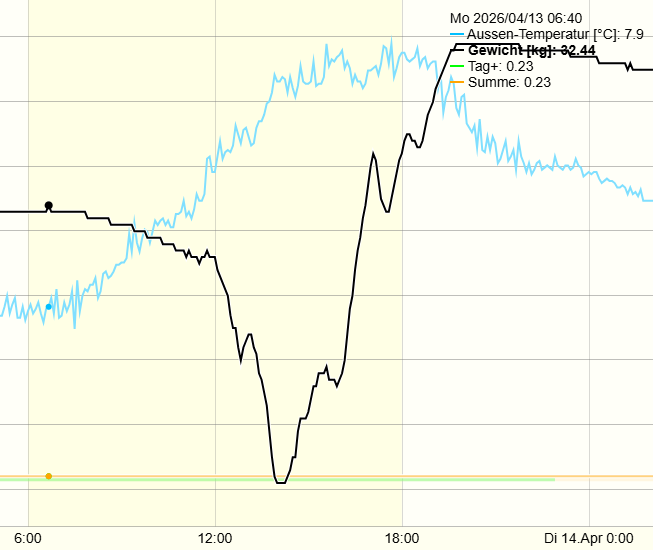 Gestern war es endlich soweit: Zum ersten Mal in diesem Jahr zeigte die Stockwaage wieder ein deutliches Plus an. Am Abend standen 230 Gramm mehr auf der Anzeige als am Morgen. Für viele mag das nach wenig klingen – für uns Imker ist es jedoch ein ganz besonderer Moment. Denn dieses erste Tagesplus bedeutet: Die Bienen finden wieder mehr Nektar und Pollen, als sie selbst verbrauchen.